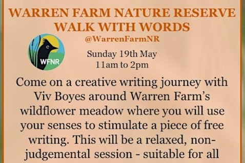 Come on a creative writing journey around Warren Farm NRs wildflower meadow with Viv Boyes, where you will use all your senses to stimulate a piece of free writing. This relaxed, non-judgemental, creative session is suitable for all writing abilities.